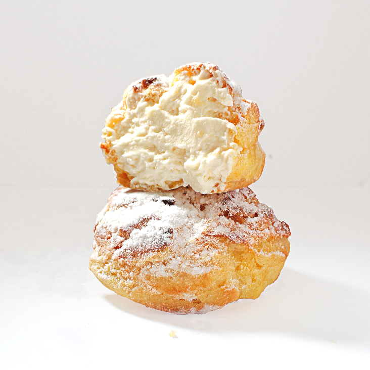 Kue soes yang lezat, dengan kulit soes yang renyah diisi dengan krim tiramisu yang lezat dan menggugah selera