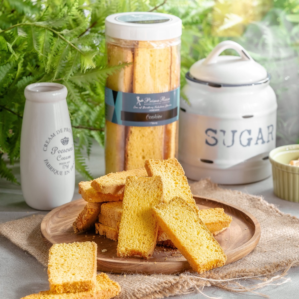 Bolu kering yang lezat dan renyah, dibentuk menjadi stik yang panjang dan tipis, membuatnya mudah untuk digenggam dan dinikmati.
