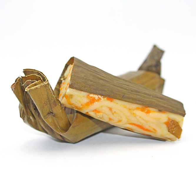 Camilan tradisional Indonesia terbuat dari mie, telur, dan sayuran yang dibungkus daun pisang dan dikukus.